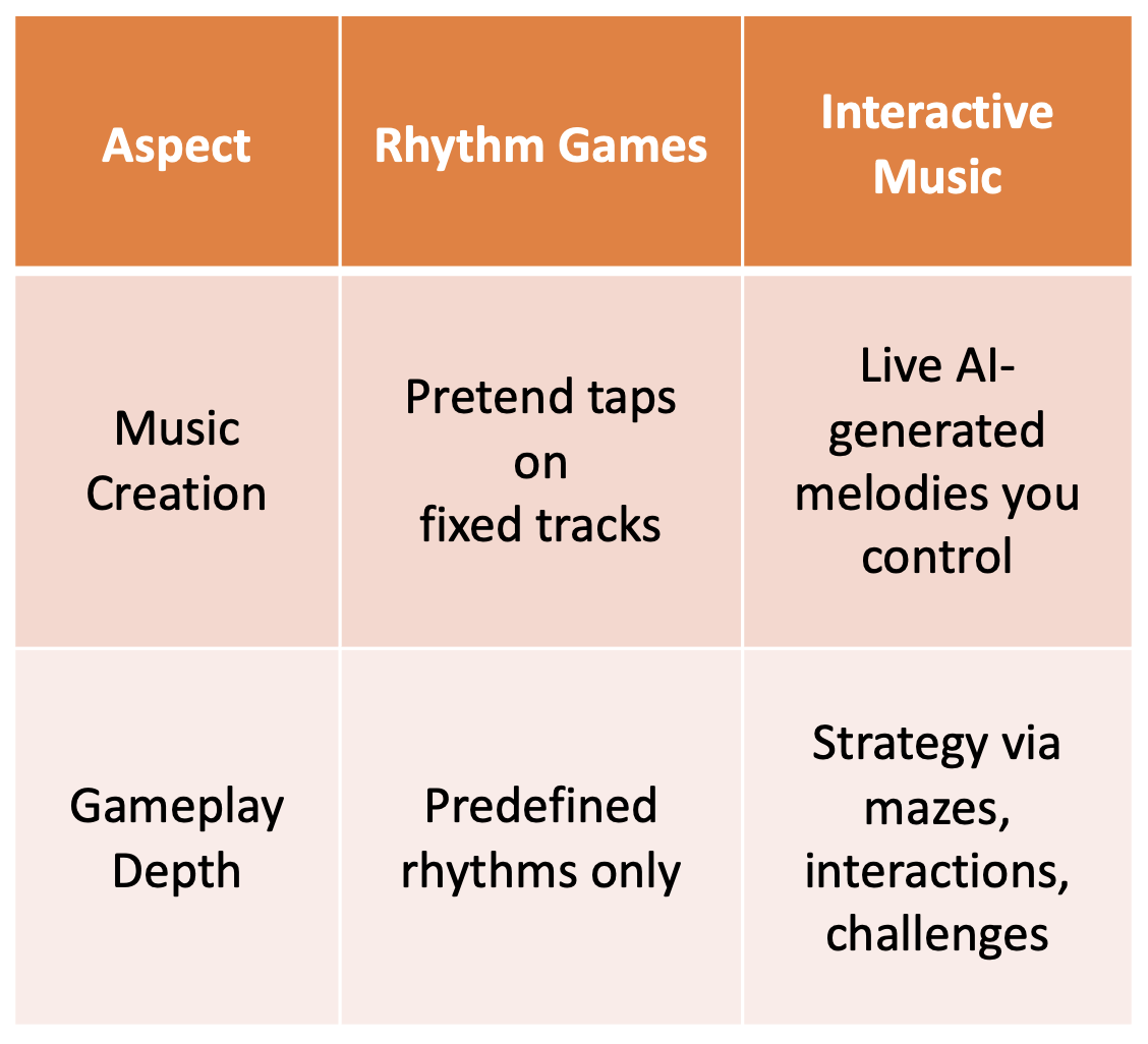 This fusion makes music the controller, not background. This is not a rhythm game, where you follow predefined beats on fixed tracks, lacking depth in strategy or creation. Nor is it a music app simulating instruments, which demands skills. Interactive Music delivers authentic improvisation with stakes: navigation demands musical decisions, turning participation into purpose.